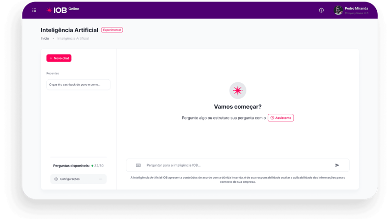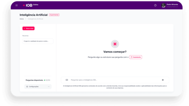 Converse com a Inteligência IOB sobre assuntos federais, contábeis, trabalhistas, previdenciários, do Imposto de Renda e do Sped.